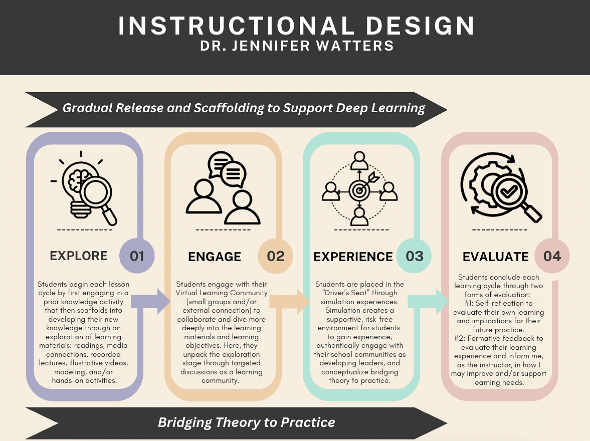 I design my instruction using a structured, student-centered approach that blends gradual release, scaffolding, and experiential learning. I begin by helping students explore and activate prior knowledge (as an example: check out how I use ChatGPT to activate prior knowledge with a Critical Friend Activity), then guide them to engage collaboratively in meaningful dialogue that deepens understanding. Through authentic, simulation-based experiences, students take ownership of their learning by applying concepts in real-world contexts. Throughout this process, I incorporate reflective and formative evaluation to support continuous growth. Grounded in experiential learning theory and the maieutic method, my instruction emphasizes inquiry, connection, and the seamless integration of theory into practice.